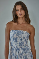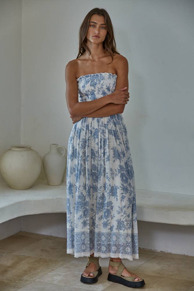 A romantic floral midi dress in a breathable cotton-rayon blend, designed with a smocked strapless neckline and a flowy silhouette. Fully lined for comfort—perfect for spring events, weekends, and warm-weather days.