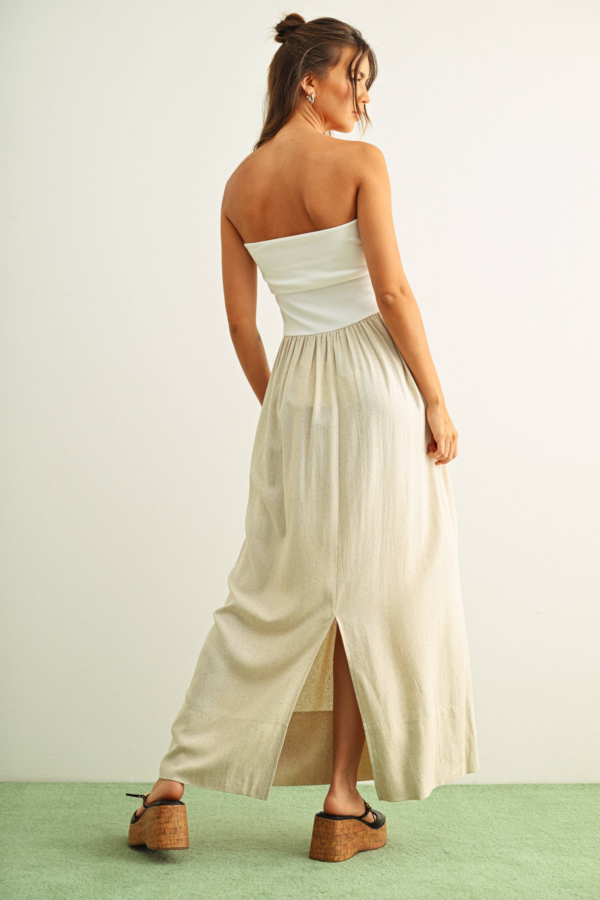 The strapless neckline gives it a clean, modern silhouette, and the gathered linen skirt adds that soft, romantic shape we love. It’s breathable, easy, and effortlessly chic.