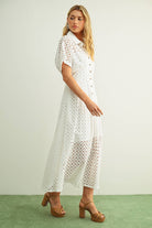 Softly romantic and endlessly timeless, The Vivienne is the kind of dress that turns everyday moments into something special. Designed in delicate eyelet fabric with a flattering button-front silhouette, this midi-length shirt dress feels equal parts feminine and polished.