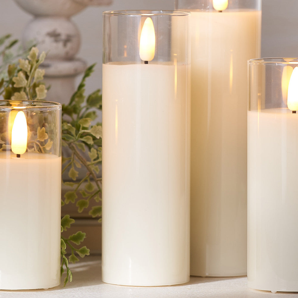 Create a warm, inviting glow anywhere in your home with this ivory LED pillar candle set inside a clear glass vessel. It offers the cozy look of real candlelight while giving you the convenience and peace of mind of a flameless design.
